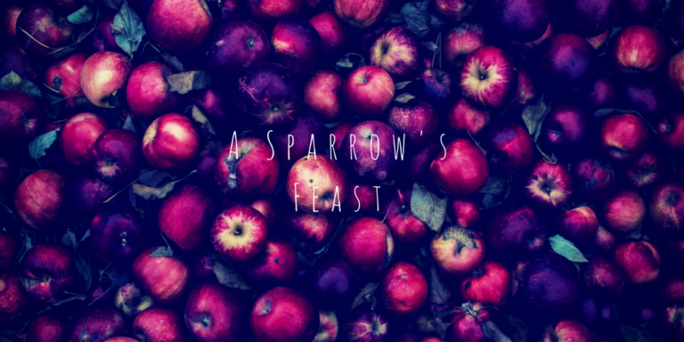 The sparrows on the roof of the garage are eating the apples that have fallen there from the tree