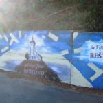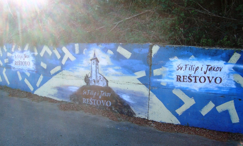 Afterwards, we walked up the hill to the old graveyard. The wall along the road to Reštovo has been painted recently, with a picture of the church at the top of the hill.