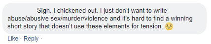 I told her about my own stories, and how they rarely feature abuse or violence. It’s not something I’ve done consciously; it just doesn’t interest me. Don’t get me wrong. People die in my stories. But it’s rarely gruesome or grisly or unnecessary. And yet, I’ve been published and ranked well in competitions. I’ve even won a big one.
