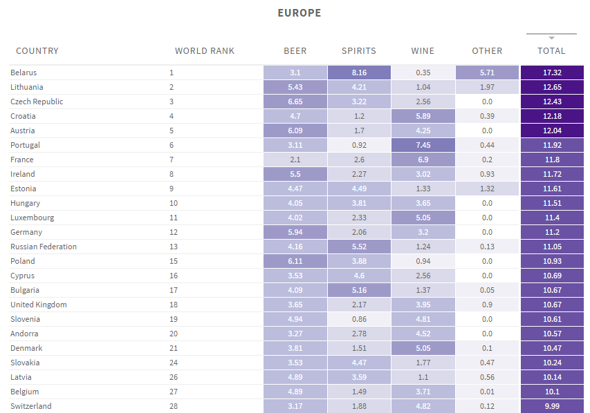 What I particularly love about the list of alcohol consumers is that Croatia is not at the top of anything. It’s quite low down in the beer-drinking stakes. It doesn’t do well at all in the spirits way. And even for wine, it’s only third after Portugal and France. But overall, it fucking nails it. Go Croatia.