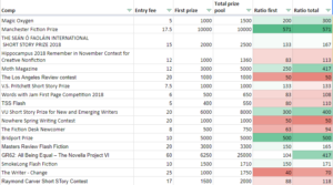 I suppose it sounds mercernary, but I’ve started keeping track of just how much return on investment I can expect for short story competitions. There are a lot of comps and I have finite financial resources and so I want to get the most bang for my buck.