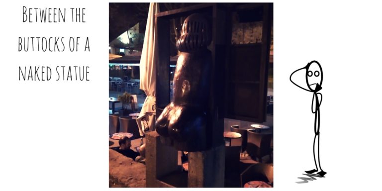 I am sitting between the buttocks of a naked statue and an ancient water pump and in the midst
